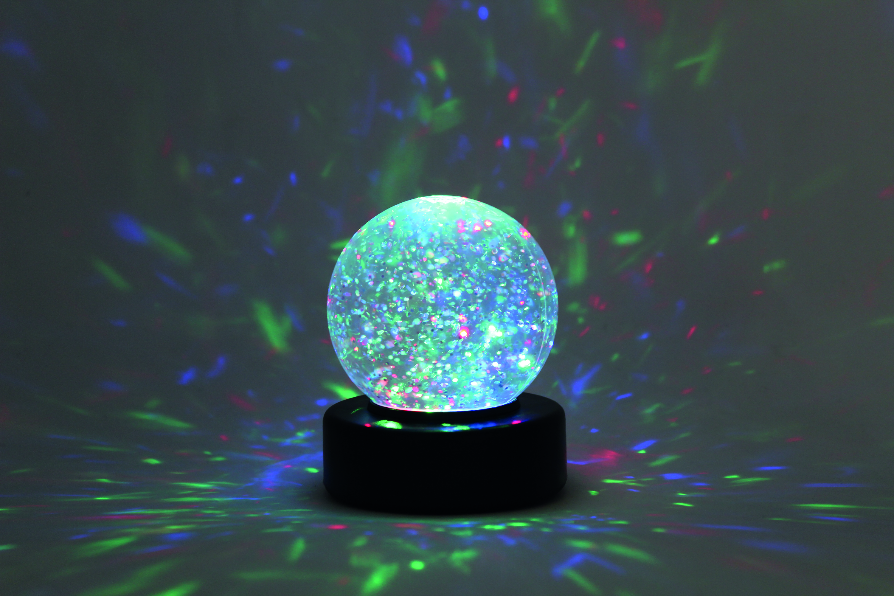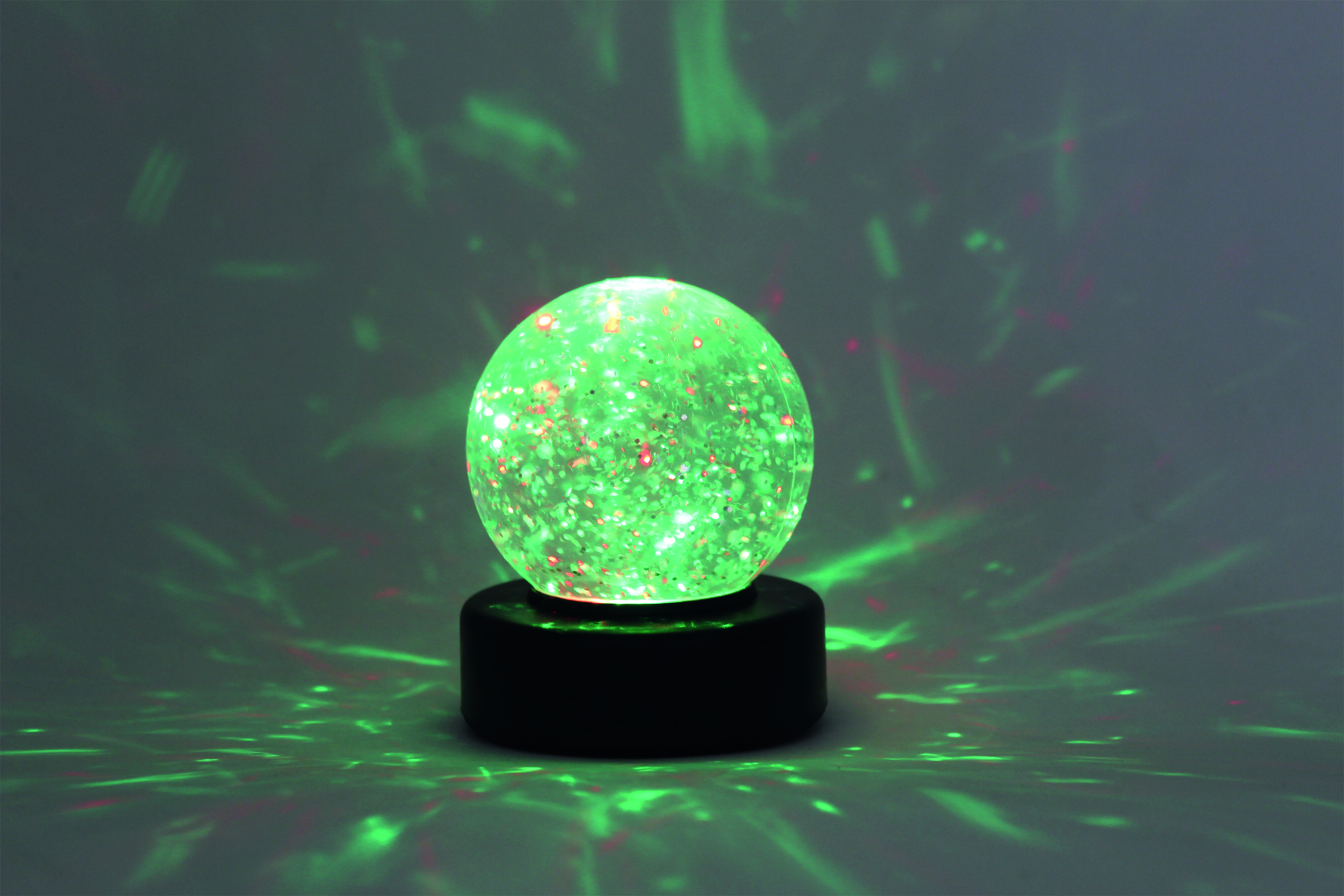 A relaxing desktop mood light, switch on colour phasing LEDs and shake to see the glitter swirl. The glitter ball requires three AA batteries to work and has a height of 100mm.