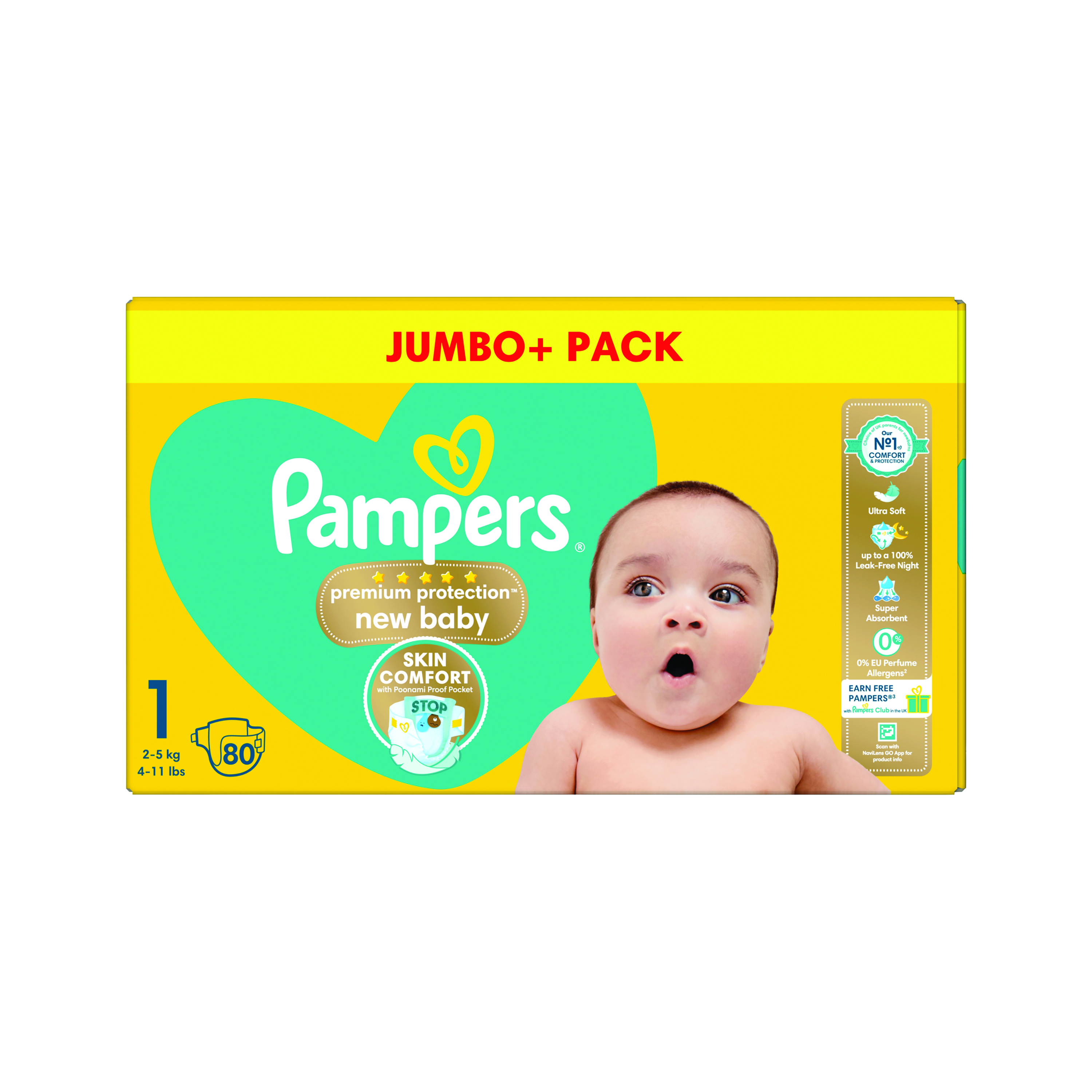 Pampers Premium Protection Nappies includes instant absorption to protect skin. Stop & Protect pocket protects against leaks. Pampers best comfort & protection for sensitive skin with millions of micropores to keep runny poo away from skin. With cushiony, ultra soft materials and a superior fastening system which gently adapts to your baby's tummy to prevent irritation, these are the only newborn nappies to be approved by the British Skin Foundation. These size one nappies come in a pack of 80.