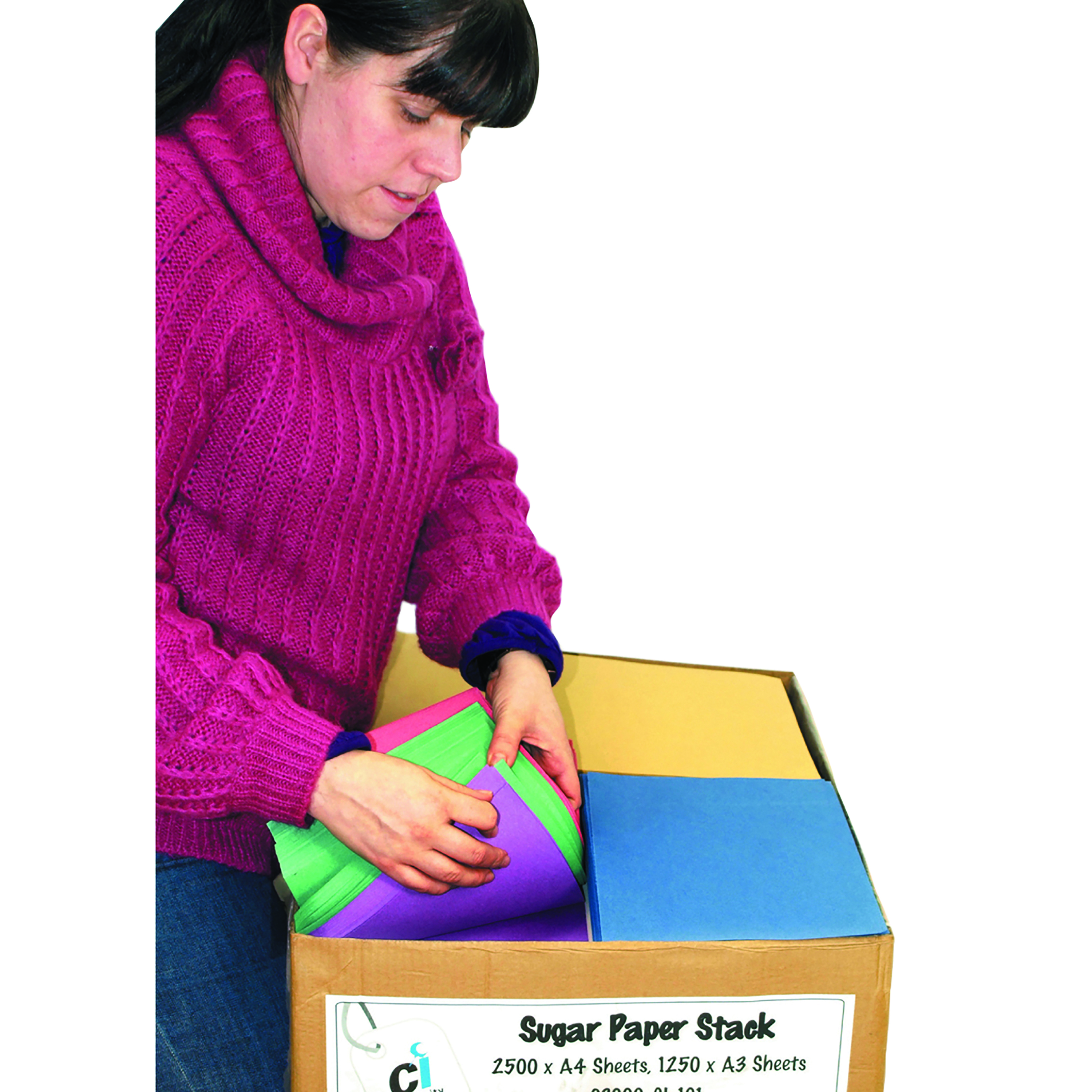 Great value bumper paper pack of 1,250 sheets which reduces wastage with options of different pre-cut paper sizes. Each pack contains at least ten colours of versatile textured paper, perfect for a range of school art and craft activities. Suitable for a wide range of mediums including chalks, pastels, charcoal, pens, and graphite pencils. This makes it an ideal choice for diverse art projects. Supplied in a sturdy storage box, ensuring the paper remains organised and easily accessible, this feature enhances classroom management and efficiency.